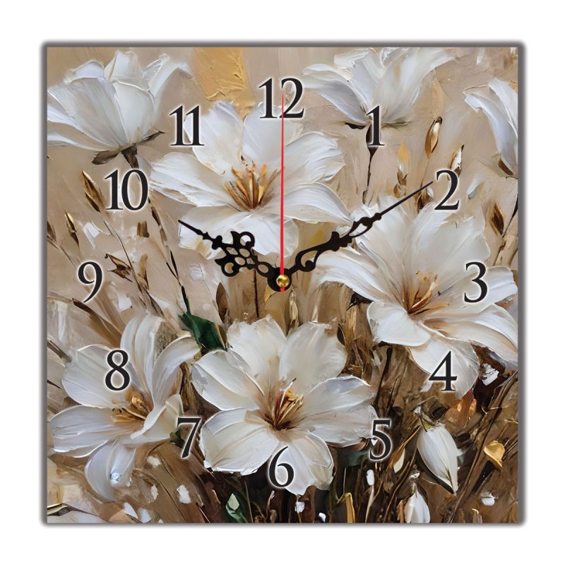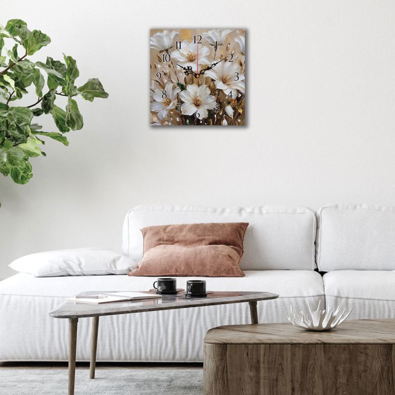 Стенният часовник с размери 30х30 см е произведен чрез висококачествен печат върху канава, опъната върху здрава дървена подрамка. Дизайнът с нежни бели цветя създава усещане за хармония и стил, което го прави подходящ за модерни и класически интериори. Часовникът е оборудван с безшумен механизъм, което гарантира комфорт във всяка стая. Той е отличен избор както за личен дом, така и за подарък за специален повод.